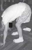 Az ágyéki gerinc alsó részén a lordosis helyett gyakran kyphosis alakul ki. Gyakran ezzel egyidejűleg megrövidülnek a lábszár hátsó és a csípő elülső izmai, amelyeknek pedig igen nagy szerepük van a medence helyzetének rögzítésében állás közben. A gyerek nem tudja nyújtott térddel a talajt érinteni, ennek oka elsősorban a hátulsó combizmok, valamint az ágyéki gerincben fellépett tartós elváltozások. (3. kép)