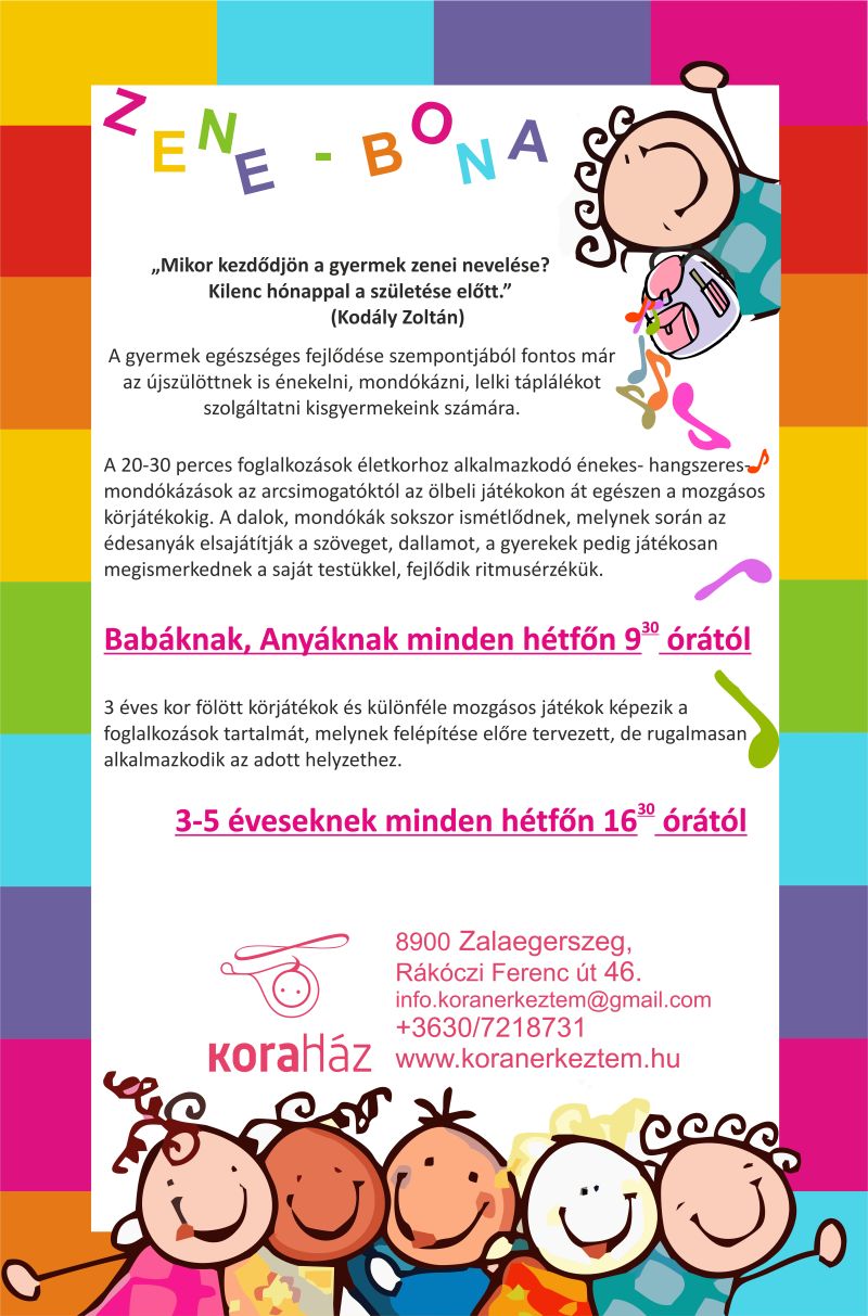 Zene-bona babáknak és ovisoknak Hétfőnként Zene-bona 9,30 órától Babáknak – anyáknak 16,30 órától ovisoknak